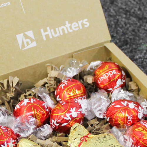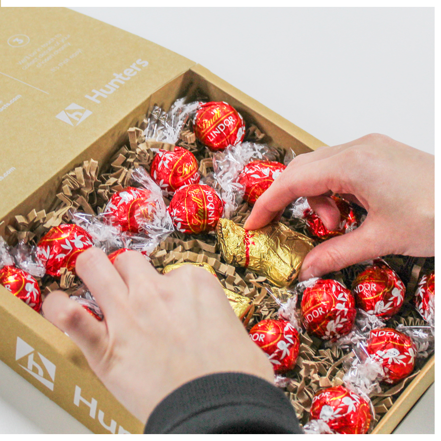 Working together, we created a bespoke rigid Kraft box made from recycled, recyclable post-consumer waste, finished with crisp white ink to deliver a clean, high-end aesthetic. Inside, Lindt chocolates added a touch of indulgence. Across all the boxes, ten chocolates were secretly wrapped in gold beneath the standard wrapper. The lucky recipients who uncovered one could choose a charity for Hunters to donate £100 to, adding a thoughtful twist to the campaign.