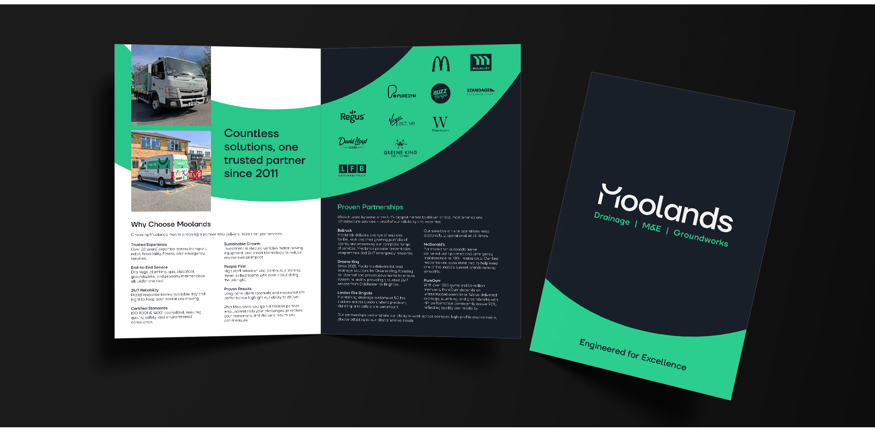 Following the approval of the new Moolands brand, BISON rolled out comprehensive fleet graphics, soft-touch laminate business cards, a custom pitch deck design, and bespoke stationery to bring their whole identity together. This rebrand process allowed Moolands to establish themselves in their industry as streamlined professionals with an eye for detail.