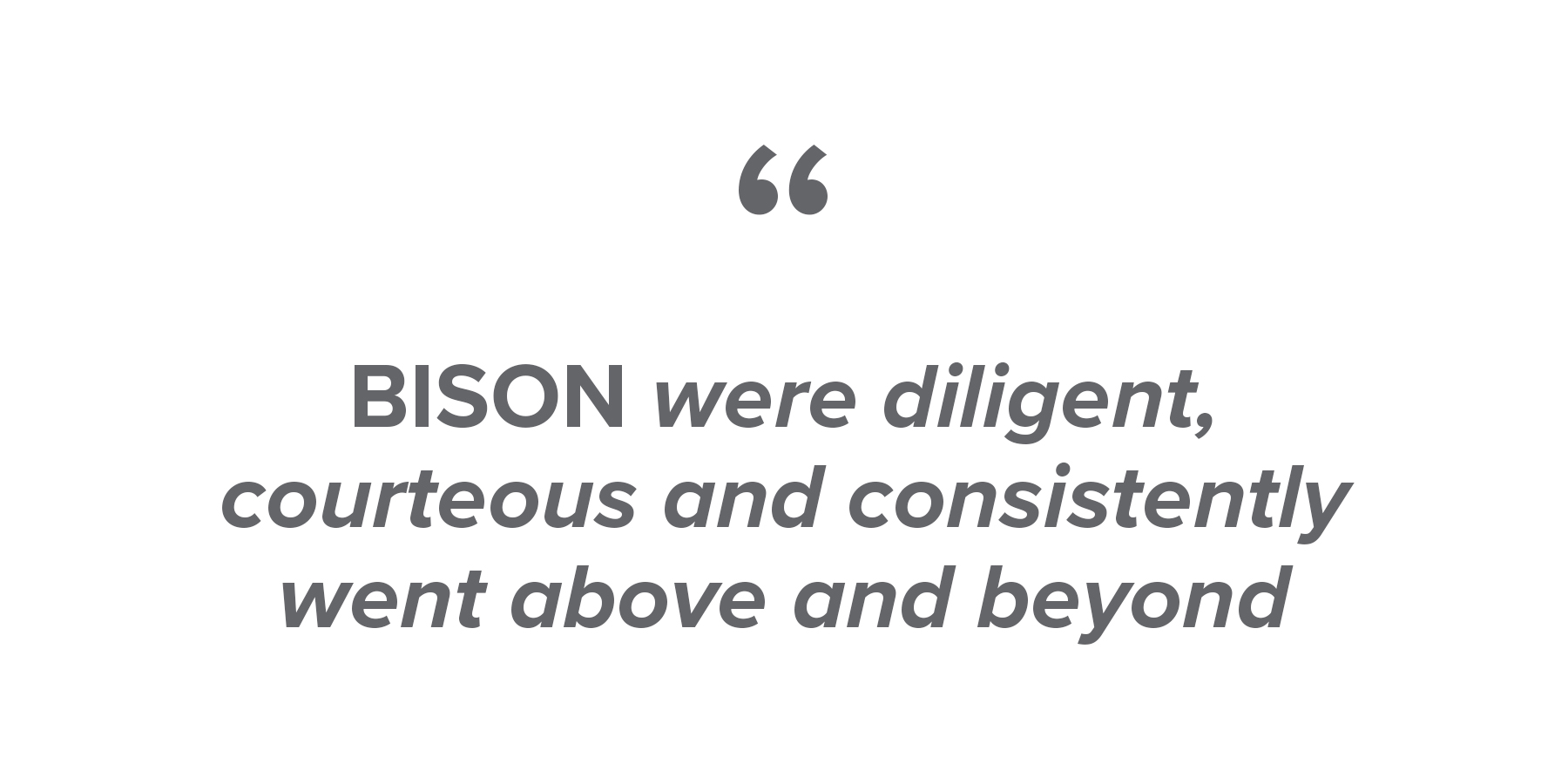 BISON were diligent, courteous and consistently went above and beyond. They listened to our ideas and were never afraid to suggest bold ones of their own. I have already recommended them several times, and I would not hesitate to do so again.